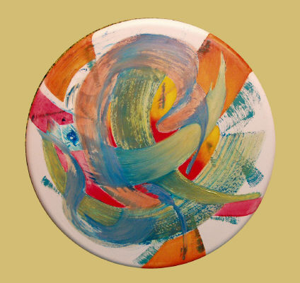 Broad shapes move from the sides to the centre. The circular format reminds one of the cycle of life which can move from cool to hot through humankinds' trials and emotions. Size - 36" round