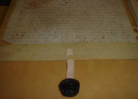 Figura 2 detalle, carta de Jacq de Molay al Maestre Provincial del Temple en Aragón con sello de cera pendiente de tiras de pergamino.