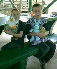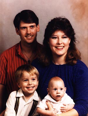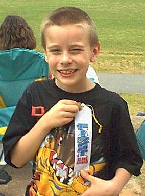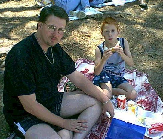| This photo of Christopher was taken in May, 2000 after he won 1st place for the frisbee throw at school. The drawing is one he did for his Grandmother Darnell, in 1999. Here are my two grown boys: Andrew (right) and Christopher(left) at the park on Easter Day, 2000. And David, with our youngest son, Andrew, at his yearly Father/Son School Luncheon.