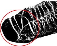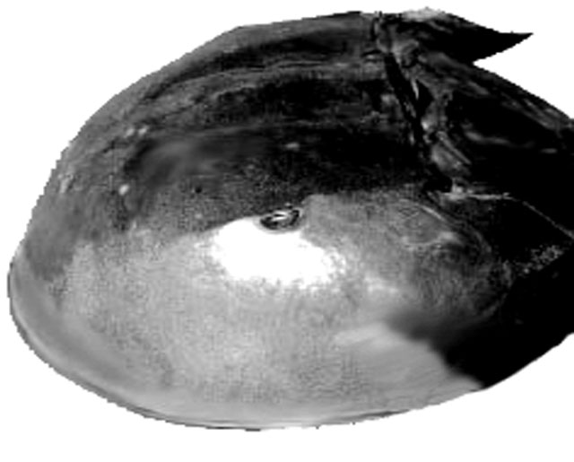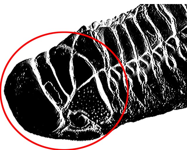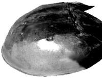 TRILOBYTES: The trilobytes were anthropods that lived at the same time as the dinosaurs and went extinct at the same time as they did too. There are many really cool trilobyte fossils in museums and I've even seen some for sale on the internet. Let's take a look at some trilobytes now and see how similar they are to their lunar cousin. (Just remember that trilobytes are way smaller than the fossil on the moon! Some of them are only a couple of inches across). In the photo on the right, you can see the large compound eyes of a trilobyte fossil. See how similar they are too the ones on the moon fossil! They take up about the same amount of space on the head, and you can also see the different texture on them the way you can see it in the high contrast photo of the moon fossil. OK this is another different kind of trilobyte. I have put a circle around its head because this one is a bit confusing to look at. What is important to notice here is that trilobytes also had body segments just like the fossil on the moon does. This particular kind of trilobyte has more joints though. LIVING ANIMALS You should know that although the trilobytes are all dead, they have some relatives that are still alive. These also look a bit like trilobytes and also like the moon fossil. Let's have a look at them. The animal on the right is called a Horseshoe Crab and anyone whose ever lived on the atlantic coast has seen plenty of these. Although it's called a "Crab", it's not really a "Crab", but as you can see is more like a trilobyte. Horseshoe "Crabs" today have only very little eyes like you can see in the photograph. But if you imagine one with big eyes, you can see that it would look very much like the moon fossil and its trilobyte ancesters. This is the last living animal that the moon fossil looks like. I found this by accident on the internet. It's called the "Spanner Crab" and it lives in Australia but like the "Horseshoe Crab", it's not really a "Crab" at all, but is another animal related to trilobytes. Well, if any one out there knows more animals on earth that might be related to the moon fossil please email me and tell me about it! The next page has the FAQ for this sight. Click here to continue.