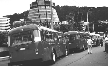Taking part in the festival were Christchurch 210 & New Plymouth 3 from Ferrymead. Dunedin Trolley 77 & Auckland 85& WCCT 80 from Foxton and WCCT buses 39, 88, 90 & 119 from The Omnibus Society. Also taking part in the parade was a "dieselised" Ansaldo and a Volvo. Volvo 205, still in Big Red colours, served as an information kiosk complete with pictures and some souvenires.
