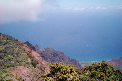 from the Pihea trailhead the trail moves along the crest of the mountains, offering stunning views of the Kalalau valley to the north-west and the forests and hills to the southeast.