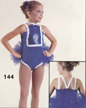 | #144 Royal blue satin front lycra back with reflection sequin bust insert trimmed in white sequins. Adjustable straps make a beautiful back. Detachable net tutu makes a great tap or ballet costume. Headpiece included. Child: 2, 4, 6, 8, 10, 12, 14 Adult: SA, MA, LA, XLA |