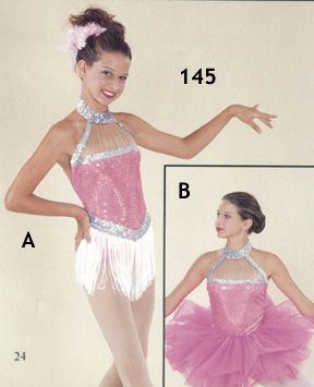 | #145 Hot pink lycra bodice with hot pink hologram mini-reflection overlay trimmed with silver hologram sequins. Nude mesh extends into halter trimmed in silver hologram sequins. Headpiece included. Accessory options: A. white fringe skirt on silver hologram waisteband. B.hot pink tutu Child: XSC, SC, MC, LC Adult: SA, MA, LA, XLA |