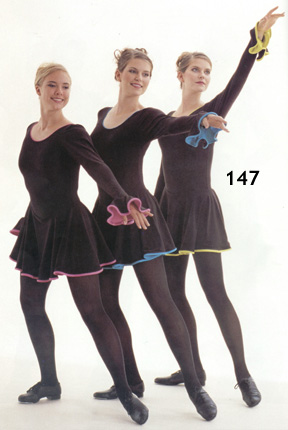| #147 Black lycra bodice with attached skirt and flared sleeves fully lined in yellow, hot pink, or aqua. The neckline is piped. Child: SC, MC, LC Adult: SA, MA, LA, XLA |