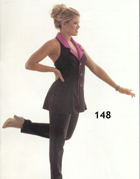 | #148 Halter-neck, long black lycra jacket with lycra hot pink colar and stationary hot pink buttons. Black pants on elastic waistband. Child: LC Adult: SA, MA, LA, XLA |