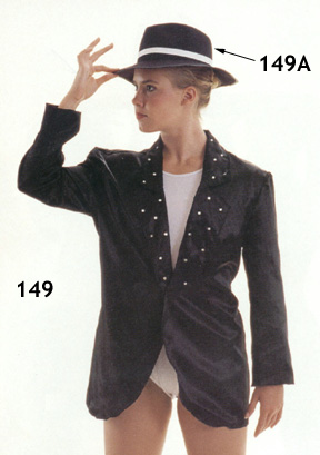 | #149 Black satin jacket with long sleeves. Black gasngster hat(149a) sold separately. Add $10.00 for rhinestones on the collar. Child: SC, MC, LC Adult: SA, MA, LA, XLA |