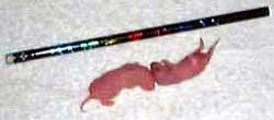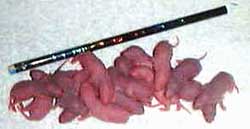 | We have babies!! Born July 3, 1999, to Alse and either Gromit or Tigger. But, I am guessing both will deny it. Imagine 15 little pink kits, chirping like birds. You can see how small they are. Here they are two days old. Now to come up with more names from chat. |