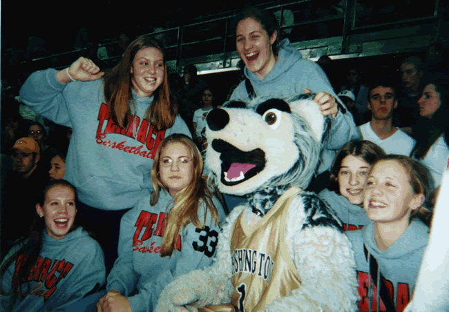 From left to right: Kelsey Voetmann, Nicole Witham (What are you doing?), Chelsea Logan, Harry the Huskie, Jen Mundt, Diane Bedwell, and Selena Leer.