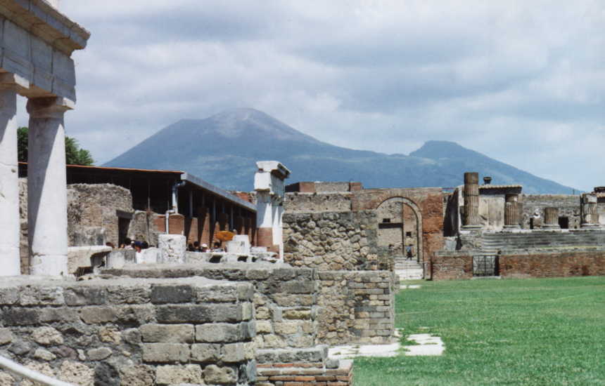 | Ruins of Pompeii, Italy with Mt. Versuvius in the background. Pompeii was once the hub of commercial activity until a massive earthquake destroyed most of the city. While some fled the city for good, those who stayed tried to rebuild the city. In 79AD, the mountain erupted and destroyed the city leaving it a virtual ghost town. |