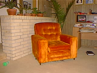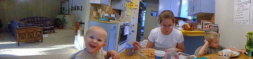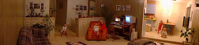 Besides being built in the 70's, and just being kind of ugly, we sort of like our new house. The picture above was created using the panorama feature on some software I just installed (no, Toby is not triplets). Notice the orange chair, a recent acquisition--we bought it at DI in Salt Lake City, and drove home with it strapped on top of the minivan. Below is a kind of warped view of the living room and kitchen (no the cabinets are not really crooked). |