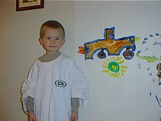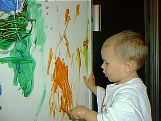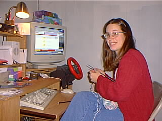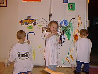 | We couldn't decide how to paint the living room, (since it has this atrocious paneling). We gave the room a coat of primer, and it still didn't look good, so we just let the kids paint on the walls. Here we have Betsy, learning how to knit over the internet (You can find EVERYTHING on the internet). |