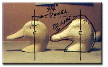 Head model on left with dowel - Outline of blank cutout on right.