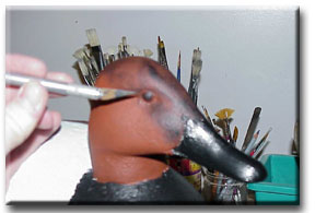 With the head done, you now paint the bill black. If you wish you are now done, well almost. If you like a satiny looking bill add 50% poly to a small puddle of black paint, mix and apply. |