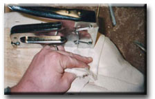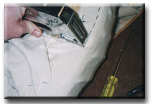 Now pull the canvas over the previously tacked section as tight as you can and secure it. |