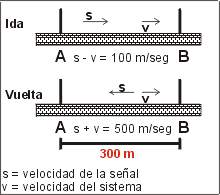 Cuando la señal sonora parte de A hacia B, avanza a razón de 100 m/s para cubrir la distancia que separa ambas placas, dado que B se aleja a razón de 200 m/seg de la señal que avanza a 300 m/seg (la señal avanza con "viento" en contra). El mismo razonamiento conduce a que los 300 m en el sentido B A se cubran a razón de 500 m/seg ("viento" a favor). Conceptualmente es como cuando un ciclista sube y baja de una colina: La subida (con la pendiente en contra) es mucho más lenta que la bajada (pendiente a favor).