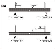 El problema surge con el RelojB, pues si también marcara 10:00:00 en el momento que parte la señal desde RelojA, al recibir la señal marcaría 3.0*0.5555...=1.666... seg más.