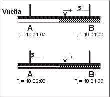 Supongamos que tenemos un reloj que funciona mediante el rebote de ondas sonoras entre dos placas planas (A y B) fijadas a una base rígida (Fig. 1). Si la distancia entre los planos A y B es de 300 metros y el sistema está en reposo respecto al aire circundante, el sonido tardará 1 seg en recorrer la distancia entre una placa y la otra, y empleará otro segundo en retornar a la primera placa. En otras palabras, cada 2 seg se cumple un período completo. Podemos usar este reloj para medir eventos, y lo tomamos como patrón de medición en el sistema estacionario.