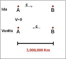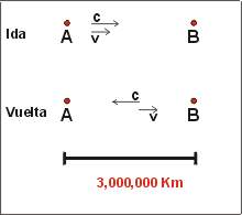 Si la distancia "real" (después discutiremos esto nuevamente) entre A y B es de 3,000,000 Km la luz avanzará a 100,000 Km/seg (300,000 menos 200,000) desde A hacia B y a 500,000 Km/seg (300,000 más 200,000) en el recorrido de B hacia A.