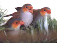 | This is one of the least expensive of all forign birds. They are very attractive little birds. They are grey with orange circling the eye and cheek area with an orange rump and orange highlights on the back. They are hard to breed in captivity because they are very shy birds. They need plenty of bushes and plants for coverage. They can be hard to sex by site. The female has a smaller orange patch than the male. They are very fast flyers as well as being constantly active. The are often seen twitching their tails back and forth much the way a Red Ear Waxbill does. My orange cheeks are always hidden in the plants unless they are bathing or eating. They nest approxamately 4 feet off the ground in a bush or plant. |