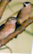 Sexing them is fairly easy. The cocks plumage is dark crimson red on the brow and front, the crop is black, the upper head is dark brown, his upperside is brown. He also has white diagonal striping on the rump, chin. The upper part of the throat is black, the side of the head is white with partial brown diagonal stripes. The underside is also white with the striping. The hen does not have the black chin and throat spots (now if you can only remember all of that!!). |