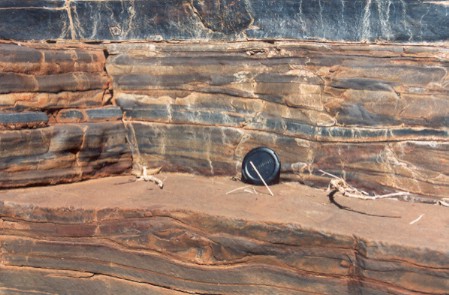 (stromatolites) or wave ripples. (the blob in the lower part of the photo is probaly just some disturbance) |