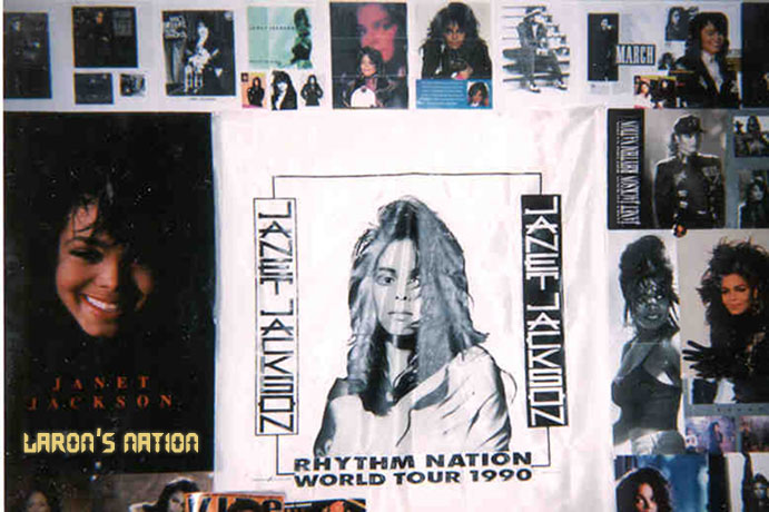 | Nation Wall 1814: "Escapade" promotional poster, Silk flag, "Rhythm Nation" Vinyl single, American Music Awards Acceptance picture, "Love Will Never Do" promo poster, Janet trading cards, (top) Photos from 1990 Tour book, Ebony cover, and more!! | |||||||||||||||||
