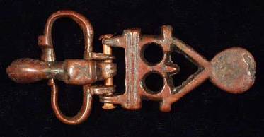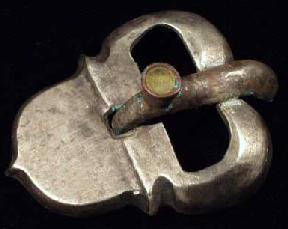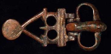 Kidney-shaped loop. Short wide tongue with cubical knob; both hinged to a openwork plate. Two perforated lugs at the rear. 2.6”(6.5 cm).