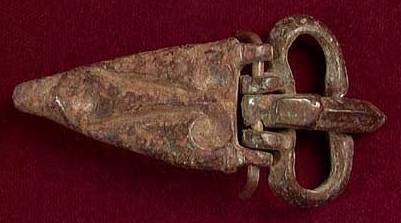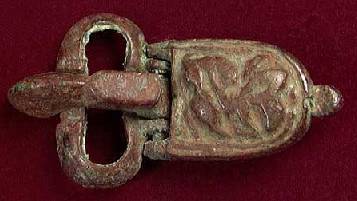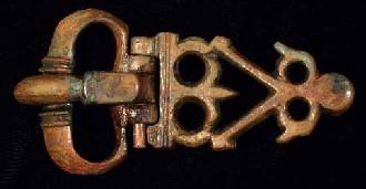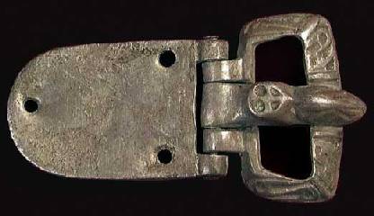 Kidney-shaped loop; short wide tongue with flat knob. Both hinged to a plate with small round lug at the top and decorated with uncertain design in high relief. 2.5”(6.4 cm).