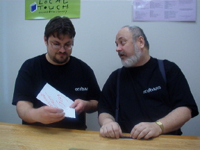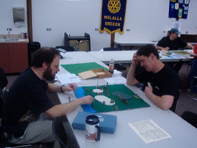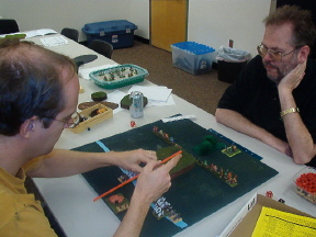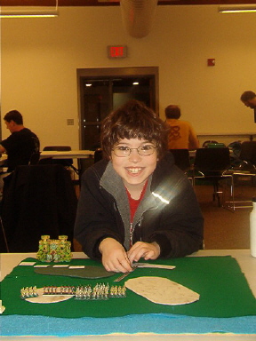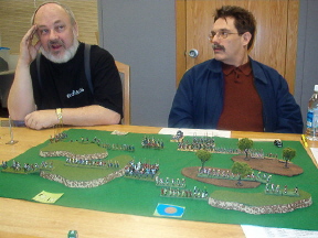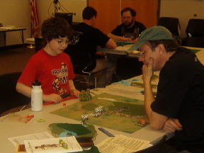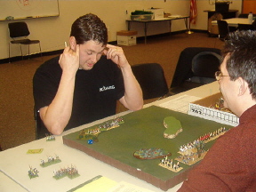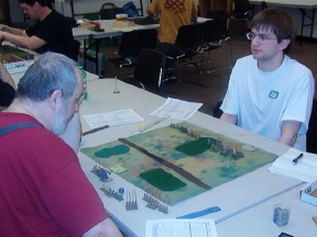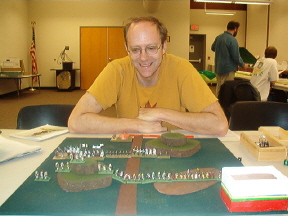 | First Place: Phil, 3.2 with Vikings Second Place: Robyn, 2.0 with Samurai Third Place: Kevin, 1.5, with Han Chinese (I think) Third Place: David, 1.5, with Tlaxcallans! Yeah! Fourth Place: Troy, 1.4, with Georgians Fifth Place: Mike, .77, with Feudal French Sixth Place: Randy, .63, with Alexandrian Imperials Seventh Place: Arthur, Child Prodigy, .46, with Sumarians, I think... Dead Last, but Clearly the Most Attractive: Mark, .26, with Bactrian Greeks Well, folks, it was a blast! We had a good turnout with nine players, and we gained two new members. Kevin, a gentleman and true sportsman, and Mark, a disreputable pirate but good fun nonetheless. Play started around 10:15 and ended at 5:30. We used a different scoring system this time. Players played a minimum of four rounds, but were allowed to play more. Thier ratio of kills to losses was then computed, and Bob's your uncle, we had a winner. To his credit, Robyn clearly had it all locked up but played an extra, and unrequired, battle against Phil anyway. Robyn made an uncharacteristic tactical blunder (for me they're a passion) and lost, bumping Phil to first place and Robyn to second. This is an example of the fine sportsmanship common to OTDBARS events. Well done both of you. A good time was had by all. On behalf of El Presidente Mas Grande Randall, allow me to compliment all of our members on their sportsmanship and gentlemanly conduct. Randall says that this was the first event he's been to which went off without a single argument. He gives credit to the rules, which are clean and simple but which allow for a great deal of creativity and skill, but more importantly he credits our members. Thanks, guys. We sold T-shirts and now have a group identity. It's only a matter of time before we start stealing hubcaps and hanging out down by the drug store... Thanks to Cascade High School for the fine silk screening. Randall wanted me to be sure to note that he learned everything he knows from Mark. Mark continues to deny responsibility, and instead blames Randall's parents... you be the judge. It was an exciting competition. People who won last time didn't even place, while old losers like myself did. Phil's Vikings actually went 3-4 against a dismounting knight army, and my Tlaxcallans (yes, a bow-heavy force) did much better than I thought they would. My compliments to Kevin, who walked into a slaughterhouse, loosing 3 elements, but who then went on to zap 4 of my own. My condolences to Mark, who walked into the same slaughterhouse and promptly died, four times. He accused me of bringing a .50 machine gun to the fight. Mark has sworn never to vacation in Mexico until he beats my Tlaxcallans. He hates them. Not me. The actual lead figures. It's very disturbing... Phil has developed into quite the tactician. He's polished his skills playing DBA online and games of HOTT with Arthur and other family members. Phil has built enough experimental terrain to fill a garage. His family hopes some sort of medication is available... Arthur, at age 10, is about 20 times smarter than me. He's a real charmer and will probably give his parents fits when he's old enough to date (his mother Ariel says he's already giving her fits, thankyouverymuch). He has a fondness for Pike armies, and earned a victory against our club president with them. Nice job, kid. Mike saw action at the head of the French and did very well against some experienced players, despite his soldiers' excessive demand for pastel colors and frequent wine breaks. He says "Garlic-eating surrender monkeys my butt! These guys rock!" Quite the poet, Mike. After the event cleared up, Randall, David, Mark and Troy stayed behind for a bit of big battle action. Mark and Randy brought Condotta and some other Italian combo to the party. Troy took his Georgians and added my Tlaxcallans as allies. The first game was played on a field choked with terrain. Troy and Randall wore each other down on the left while Mark killed 3 of my bows on the right. Then my boys started rolling high and blew threw his right-of-line, followed by a narrow victory for Troy, winning us the game. We did it again on a polo field, with nearly identical results. Roll sixes, my friends. Roll sixes. |