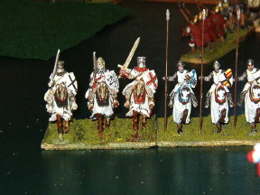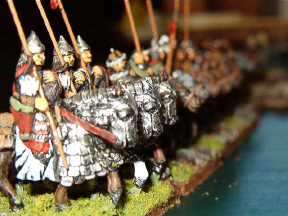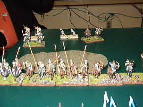 | Troy enjoys purchasing large lots of 25mm minis on ebay and painting them up, whether they make a whole army or not. He's compulsive. We've held interventions, sent him to Betty Ford... no good at all. The up side is that I get to play DBA on the big board with some fine-looking 25's. Here they are. Enjoy. Top to Bottom: 1. Troy's "Box o' Manpower"... he estimates that he's painted something like 500 minis. 2. Mongol Heavy Cav... I used these to shred his Teutonic Order army. 3. Heavy Cav top view, with Numidians pressed into service in the rear as the light cav elements. See, if he ordered enough Mongols, the numidians wouldn't have to time travel. 4. Knights of different vintage. The ones on the left are, we think, 13th century or so. The far right knight on the left stand is actually a Games Workshop figure designed for Warhammer Fantasy Battle. The knights at right are 11th century... ish. |