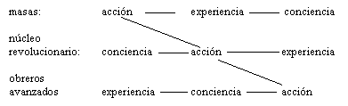 Por la forma en que están planteadas las cosas, es evidente que el punto de partida de esta discusión es una definición precisa de lo que es la vanguardia, qué papel cumple y cuáles son sus relaciones con el partido bolchevique. En el trabajo que citamos más arriba, [ 7 ] Mandel, adelantándose a las conclusiones del documento europeo, trató de dar una interpretación teórica sobre el nuevo papel del partido bolchevique y el de la vanguardia. En este cuadro que resume toda su concepción señala que hay tres segmentos fundamentales en la formación de la conciencia de clase: las masas, que avanzan de la acción a la experiencia y de allí a la conciencia; los obreros avanzados, de la experiencia a la conciencia y de la conciencia a la acción; y el núcleo revolucionario, de la conciencia a la acción y de allí a la experiencia: