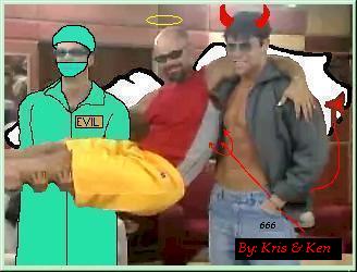 | ~*Well I'm sure you have all noticed the picture here and have had your laughs and giggles...But seriously, Is this 'doctored' picture not a friggen, awesome piece of art? Ugh, the pride I feel just knowing that me and my brother could create such a masterpiece is unbelievable. *LOL* I love it. Anyways, so yes not only have you admired the above picture for it's beauty, I'm also very positive that you have noticed that we have reason to believe someone in the Big Brother house has been turning a little more "evil" lately...and others, well their starting to look a whole lot more good in comparision. Okay so let's sit back and analyze this situation a little more closely so you can all understand where this girl is coming from...Lately it seems that "Mr. Look at me" Hardy Hill is turning to the dark side...His looks and personality that the majority of us, including me, respected at the begining of Big Brother 2 have changed, only to lead the viewing public to believe that Hardy's true colors are begining to show themselves. In recent weeks this guy has successfully schemed, lied, and betrayed people left and right with his accomplice Nicole! Not only has Hardy's actions depicted him as evil, but so has his brand new appearance...Let's see...dying his hair black, turning to alcohol and cigarettes and some major under eye luggage has definitaly contributed to seeing him as nothing more than just plain mean. However, while Hardy is looking more to Satan's side of things, it seems as though Will is leaning more towards Bunky's plans. Spending more time with Bunky seems to have made Will a more tolerant and compassionate person inside the house. I mean I'm not saying that Will is a saint, by all means no...But he has seemed to change. Of course he is still the same old halarious, evil doctor, "lying snake in the grass" that we all know and love but in many situations he has encountered lately have shown that there is more to Will than "circuitry and metal" like he has, on so many occasions claimed...and that's nice to know. In addition to our own assumptions Will's brother was on the show a few weeks back and had confirmed all of our beiliefs by making a statement that Will is in fact the most loving, appriciative, compasionate, wonderful guy in the world...*~ |