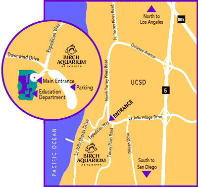 The Birch Aquarium at Scripps provides ocean science education to the public through creative exhibits, programs, and activities designed to help them better understand the relevance of science to their daily lives. The Aquarium interprets research from the Scripps Institution of Oceanography, emphasizing the interdisciplinary nature of the sciences used to study the earth, and inspire public support of scientific endeavor. In addition, the aquarium promotes conservation through education and research, so that people will respect and protect the marine environment. |