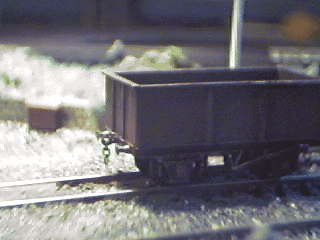 I purchase the coupling chains as a 1 Metre length which is already chemically blackened and very close to scale. I cut each 4th link of the chain to produce 3-link coupling chains, these are simply hooked onto each wagon and fixed by applying a small amount of slow setting super glue on the end of a track pin to the bottom inside face of the coupling hook, dropping the chain in and lightly pushing the chain into place with a cocktail stick or track pin. Using slow setting super glue allows time for positioning of small detail parts before the glue `takes hold'. I use `Humbrol super glue thick' which sets in 30 - 45 seconds. The chains on `old stock' are also brushed over with a couple of different shades of brown acrylic to simulate rust, which will come off as the couplings are used, so the most used wagons will simply have more black chain showing than those that have been on less workings.