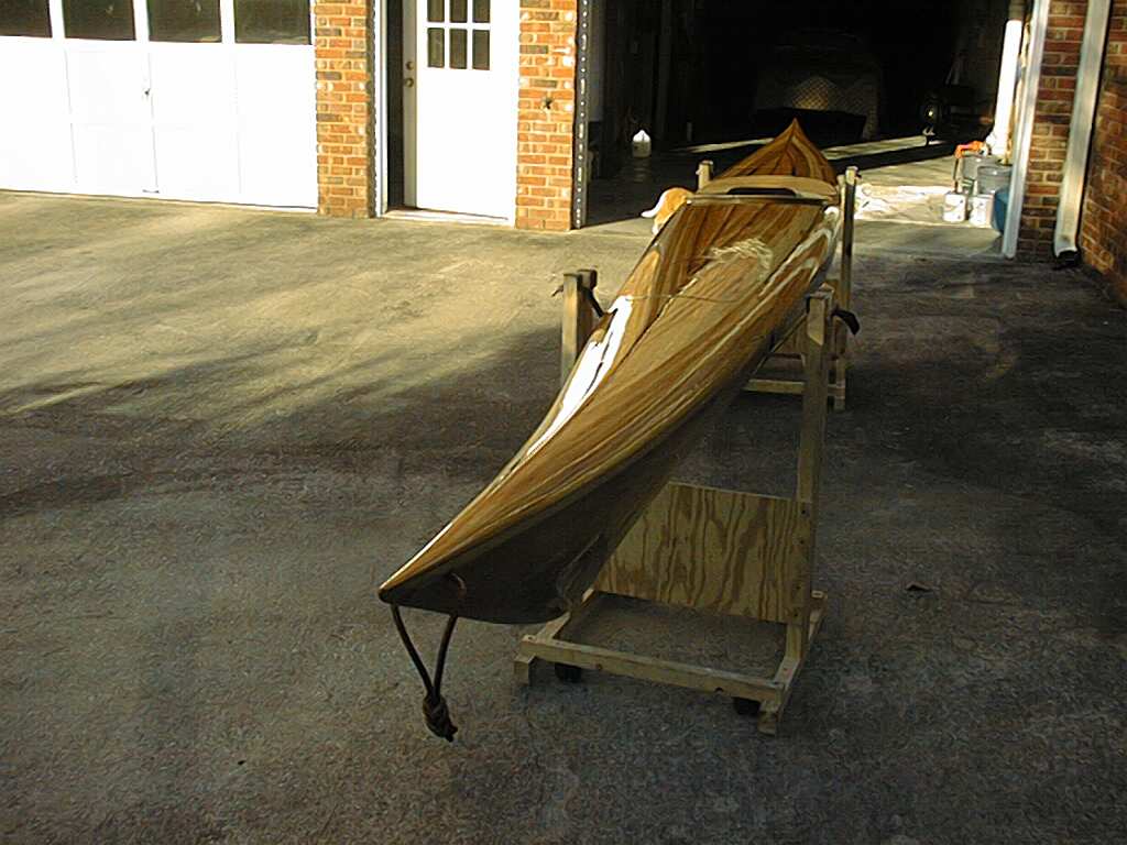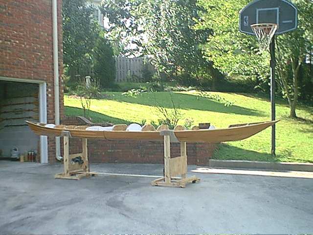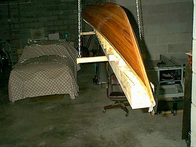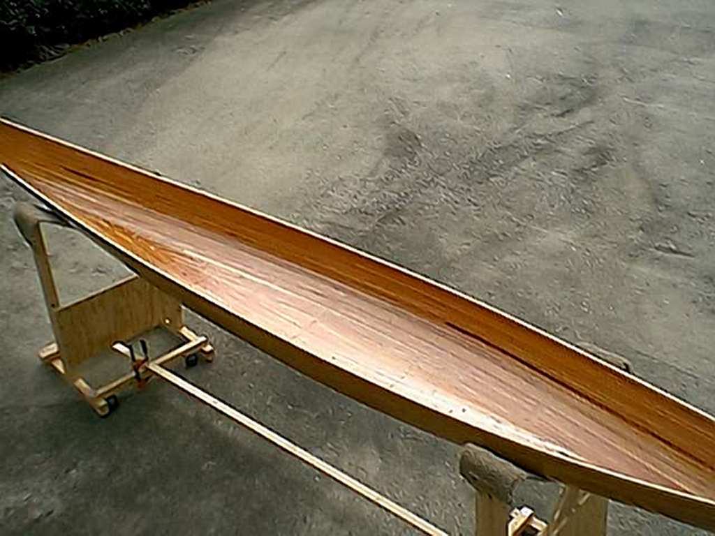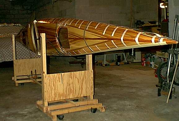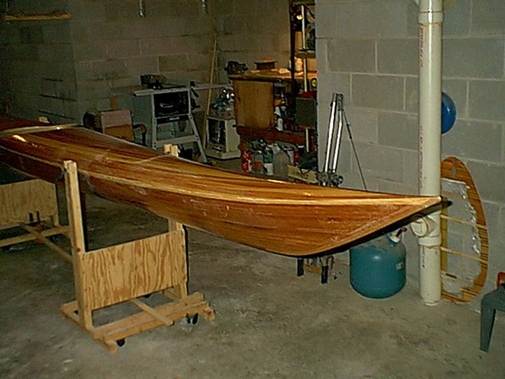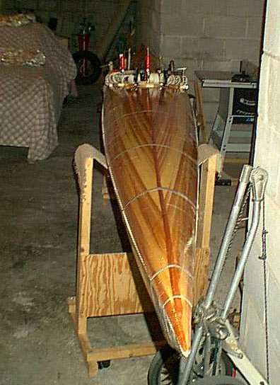 Hull: Forms on a strongback, laying cedar strips, sanding, fiberglassing inside& out.