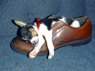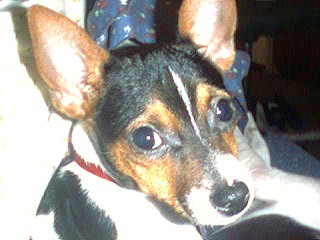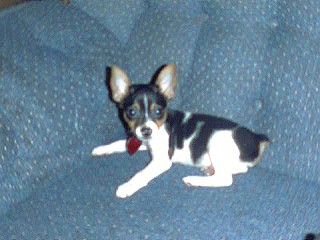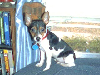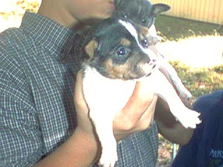 Gizmo is a Tri (black/white/tan) Toy Rat Terrier with a natural bob tail he should be 6 lbs when full grown. He has an "A" body type. |