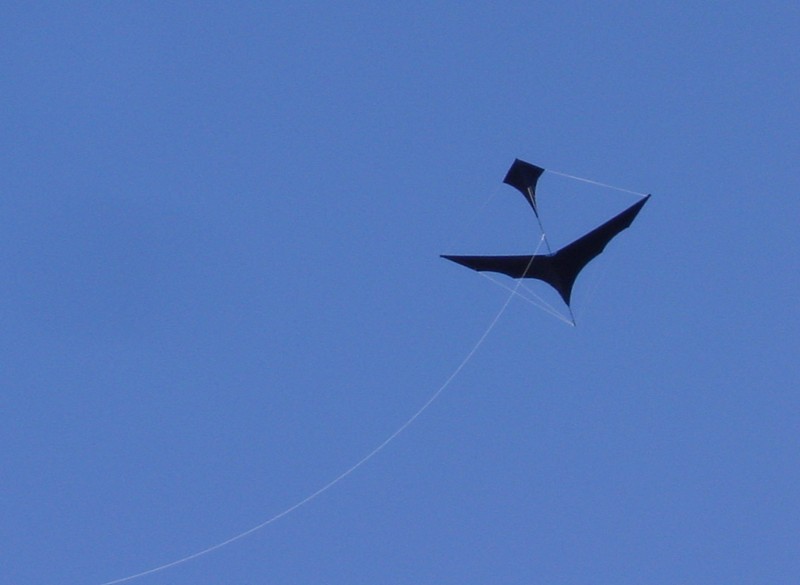 The twisted log cabin kite is sparred like a giant fighter; but being 5 x 5 ft it requires
