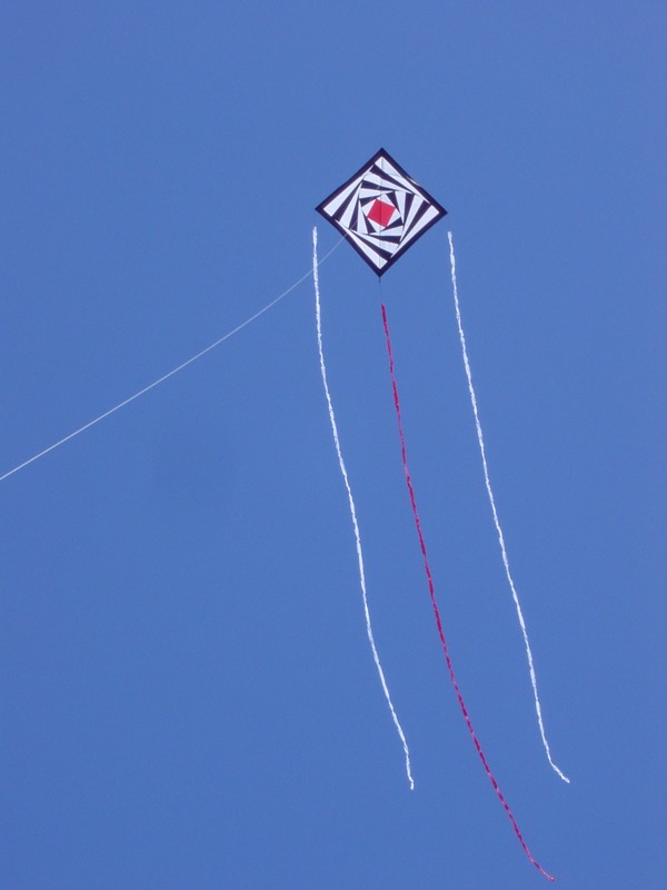 Randy Shannon taught this variation of a traditional Guatemalan kite. It is constructed of bamboo (from a window blind), cotton string, and tissue paper. In spite of its fragile appearance it flies really well.
