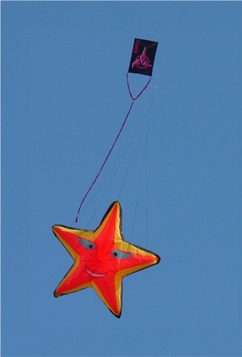 I attended the Fort Worden Kitemakers Conference in March 2002, including a workshop taught by Rolf and Claudia Zimmermann. They are well known for their marine themed soft kites and line laundry. In this class they showed us how to build a small (approx 4 foot) sea star line laundry object.