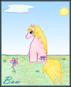 | "Bow" The media used in Bow was pencil and colored pencil. Her story: Bow likes to see friends on their birthday! Bow is a Newborn Pony! Bow took me 2 hours to complete and was finished on November 29th, 2003. I wanted to draw a birthday like pony since the day before she was drawn was my birthday. I like her color scheme and like the way she turned out in general. She is a birthday treat. Bow was colored with PrismaColor pencils and I added the sky in Paint Shop Pro. I hope you enjoy Bow! Back to Colored Pencil Gallery |