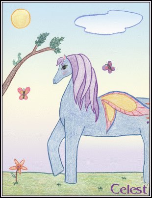 | "Celest" The media used in Celest was pencil and colored pencil. Her story: Celest gets many visitors everytime she walks threw Ponyland. Celest is a Fairy Pony. Celest took me 3 hours to complete. She was finished on November 25th, 2003. I wanted to make another Fairy Pony and out came Celest! I wanted to make more friends of her's in this piece though so she has many. I am happy with the way Celest turned out and there isn't anything I don't like about this piece, it's one of my favorites. Celest was colored with PrismaColor pencils and the sky was added using PhotoShop. I hope you like Celest! Back to Colored Pencil Gallery |