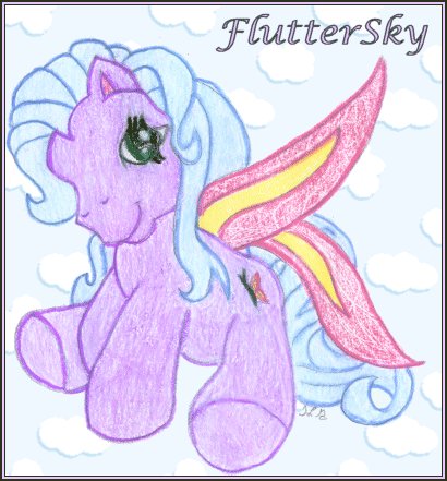 | "FlutterSky" The media used in FlutterSky is pencil & colored pencil Her story: FlutterSky loves to watch butterflies. She is a social little pony and has many friends. FlutterSky was inspired from the G3 ponies. I had a Hasbro drawing in front of me. I didn't trace but I did definantly let it help me with putting her in proper perportions. The hair for these ponies is different then the G1 ponies so I had to use the Hasbro drawing to help me with that as well. I colored her using PrismaColors and I added the background using Paint Shop Pro. I wanted to create a pegesus because Hasbro isn't putting them out anymore it looks like. She turned out to have Butterfly wings instead but I really like them. I made her symbol match her wings. I hope you enjoy FlutterSky as she is one of my favorites I have done so far. FlutterSky was drawn on October 29th, 2003 Back to Template Gallery |