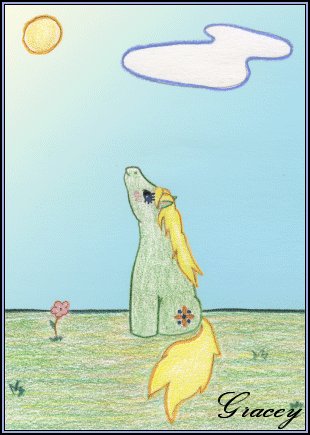 | "Gracey" The media used in Gracey was pencil and colored pencil. Her story: Gracey likes to make shapes out of the clouds! Gracey was suspose to be a Newborn Baby Pixie Pony but I left her wings off. I liked her the way she was. I am new to drawing such small ponies but I am liking the turnout already. Gracey took me about an hour and a half to complete and was finished on November 19th, 2003. I colored her using PrismaColors and added the sky in PhotoShop. I hope you enjoy Gracey as much as I do. Back to Colored Pencil Gallery |