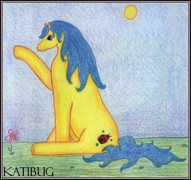 | "KatiBug" The media used in KatiBug was pencil, art stix, & colored pencil. Her story: KatiBug sees her best friend off in the distance and waves for her to come over! KatiBug was completed on December 22nd, 2003. She took me about 3 hours to complete I am in love with this piece! I love everything about it and I just love ladybugs. I created KatiBug using pencil as the outline. Then I used PrismaColor Art Stix for the base color and added some detail with PrismaColor Colored Pencils. I hope you enjoy KatiBug as much as I do. KatiBug is being featured in the art section of the MLP Arena! Back to Colored Pencil Gallery |