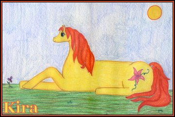 | "Kira" The media used in Kira was pencil and colored pencil. Her story: Kira enjoys her day of relaxation! In this piece I have changed the way I do the eyes to a more anime feeling type. I do like the turnout. Her body is a little too long so she is slightly out of porportion but though that is a flaw of this piece I still like the way she turned out in general. I love her colors and her symbol is nice too. This piece took me about two hours to complete and was finished on December 27th, 2003. I used PrismaColor Color pencils and PrismaColor Art Stix to create this piece. I hope you enjoy Kira as much as I do! Back to Colored Pencil Gallery |