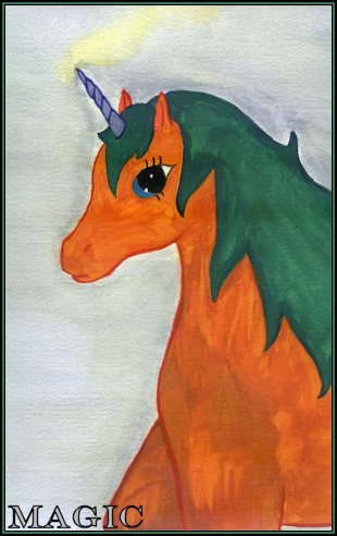 | "Magic" The media used for Magic was pencil, watercolors, and colored pencil Her story: Magic tries to brighten up a gloomy day in Ponyland! This piece is a little different then I normally do watercolors. I do love the outcome and wish I would have drawn the entire unicorn. This shows four seperate layers for each color. Magic was drawn up with pencil then painted using Grumbacher, See For Yourself Watercolors. I added some but not much detail with PrismaColor Pencils. I only used colored pencil on her eye and to lighten up the horn some, the rest of what you see is pure watercolor. I have a deep appreciation for this piece and it's actually one of my favorites. This piecetook me 3 hours to created and was completed on December 22nd, 2003. Back to Watercolor Gallery |
