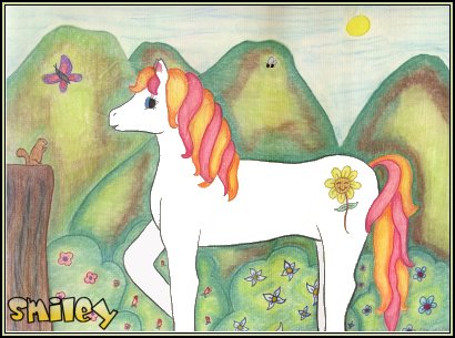 | "Smiley" The media used in Smiley was pencil & chalk pastel Her story: Smiley is all about going for nature walks at least once a week. Smiley was completed on January 2nd, 2004. She took me about three hours to complete. I put Smiley in a totally different scene then I do with any of my other pieces. I got tired of doing the same old background and needed a change so here it is! I do like the way this piece turned out but there are a few things I would change if I had to redo it. Some of the things in this piece aren't exactly right but that's ok. This piece is fully sealed so not to smear or break down over time. Smiley was drawn up with pencil, colored with Conte Chalk Pastels, and blended using a blending tool. Then this piece was sealed using PrimaColor Final Fixative Gloss, the best sealer I have ever used! I hope you enjoy Smiley as much as I do. Back to Chalk Pastel Gallery |