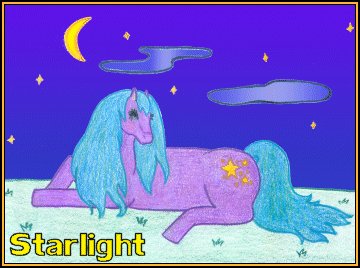 | "Starlight" The media used in Starlight is pencil & colored pencil then greatly modified in Adobe PhotoShop. Her story: Starlight enjoys laying under a clear night sky when stars blanket it. I wanted to draw another pony laying down. I started drawing her and realized that she would turn out to be a nighttime pony. I added her symbols and named her and this is the turn-out. I do like Starlight's symbols, color scheme, and background. I edited her in Adobe PhotoShop to give her her nighttime sky. Everything else was done by colored pencil. Starlight was completed November 16th, 2003 and took me about 2 and a half hours to complete. I hope you enjoy Starlight! Back to Computer Modified Gallery |