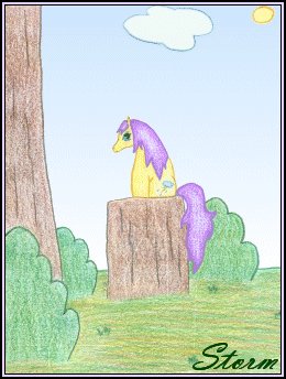 | "Storm" The media used in Storm was pencil and colored pencil. Her story: Storm likes sunny days but she enjoys rainy ones more. Storm is a Newborn Pony! This piece took me 2 hours to complete and was finished on November 27th, 2003. I wanted to create another piece with a woodland setting and I was in the mood to draw another Newborn Pony, this was the outcome. I like the colors used in this piece and love the way it all turned out. I love Storm's symbol as well. This piece was colored with PrismaColor pencils and I added the sky in Paint Shop Pro. I hope you enjoy Storm! Back to Colored Pencil Gallery |